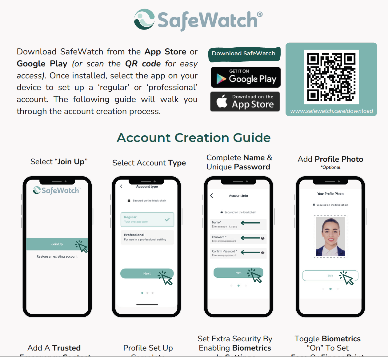 Share with your clients or print to display in your office. This document highlights what SafeWatch is, who it is for and a QR Code for clients to download the app.
